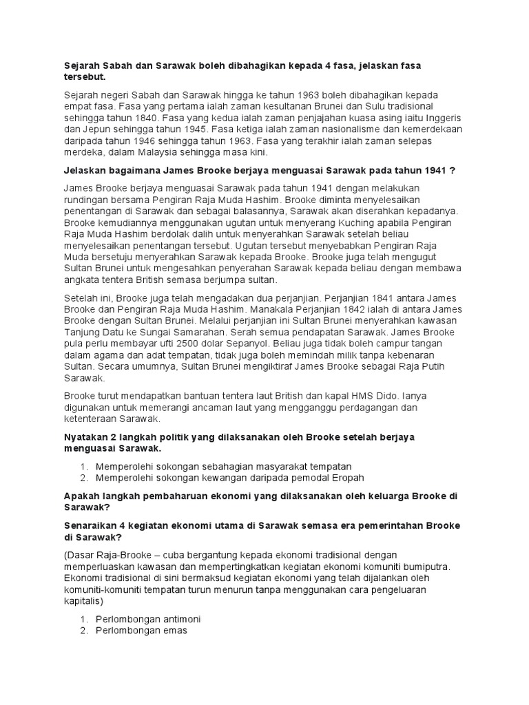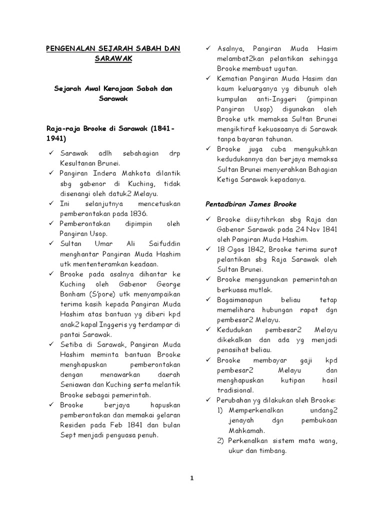 Namun, penyerahan ini telah mendapat bantahan yang hebat oleh rakyat tempatan. 2 zurina ismail, sarawak bumi kenyalang, selangor: Dari segi liputan maklumat sejarah, buku teks sejarah tingkatan 1mengandungi 11 bab, yang sepatutnya memberi fokus mengenali setiap negeri dalam malaysia. Latar belakang sabah dan sarawak. sejarah zaman kesultanan brunei dan sulu tradisonal hingga tahun 1840 sejarah zaman penjajahan kuasa asing (inggeris dan jepun) hingga tahun 1945 sejarahzaman.